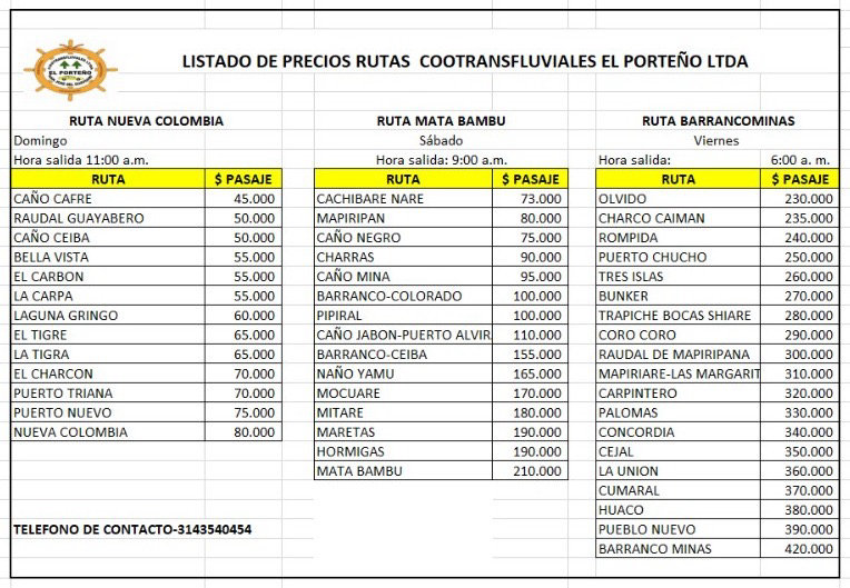 Transporte fluvial Iriani Tours S.A.S Contacto: +57 3115014467 Ruta: Barrancominas – Inírida los días Domingos.