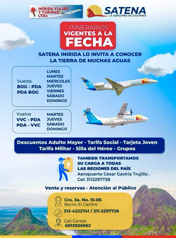 La forma más rápida para llegar a la ciudad de Inírida capital del departamento del Guainía es a través de vía aérea con la aerolínea Satena, que tiene vuelo directo todos los días desde Bogotá con una duración de vuelo aproximado de 1 hora 45 minutos y desde Villavicencio vuelos directos 4 veces a la semana con una duración aproximada de vuelo de 2 horas 10 minutos.