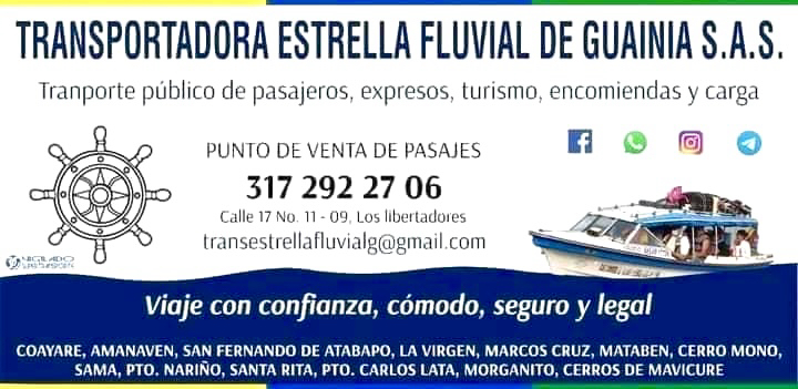 Desde Puerto Nariño Vichada se debe tomar el transporte fluvial en la línea que brinda su servicio todos los días y va directamente hasta la ciudad de Inírida – Guainía. Este recorrido puede durar aproximadamente 6 horas. La Transportadora Estrella Fluvial del Guainía SAS quien brinda el servicio de transporte fluvial desde Puerto Nariño Vichada, recomienda realizar la reservación del pasaje con mínimo un día de anticipación comunicándose a los números que aparecen en las imágenes a continuación.