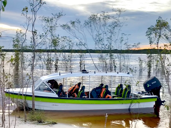 Esta embarcación tiene capacidad para 8 personas. Está equipada con un motor 60 Suzuki 4 tiempos, cuenta con sillas acolchadas e inclinadas que ofrece una experiencia cómoda en recorridos de larga duración. El operador es una persona certificada, responsable y con gran conocimiento de los ríos que se navegan. El techo de la embarcación es firme y fuerte que permite la acomodación del equipaje sobre ella.